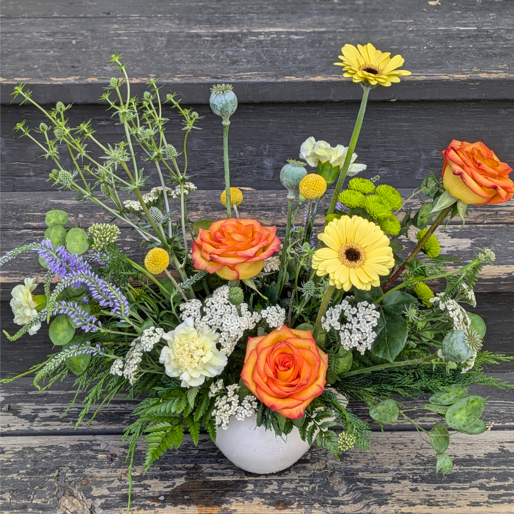 A bright and bold arrangement of seasonal flowers in bright cheerful colours. Hand-arranged and presented in a ceramic vase.