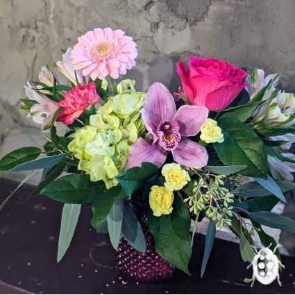 Beautiful seasonal vase arrangement of pinks, yellows and ivory blooms. Hand-arranged and presented in a glass vase.
