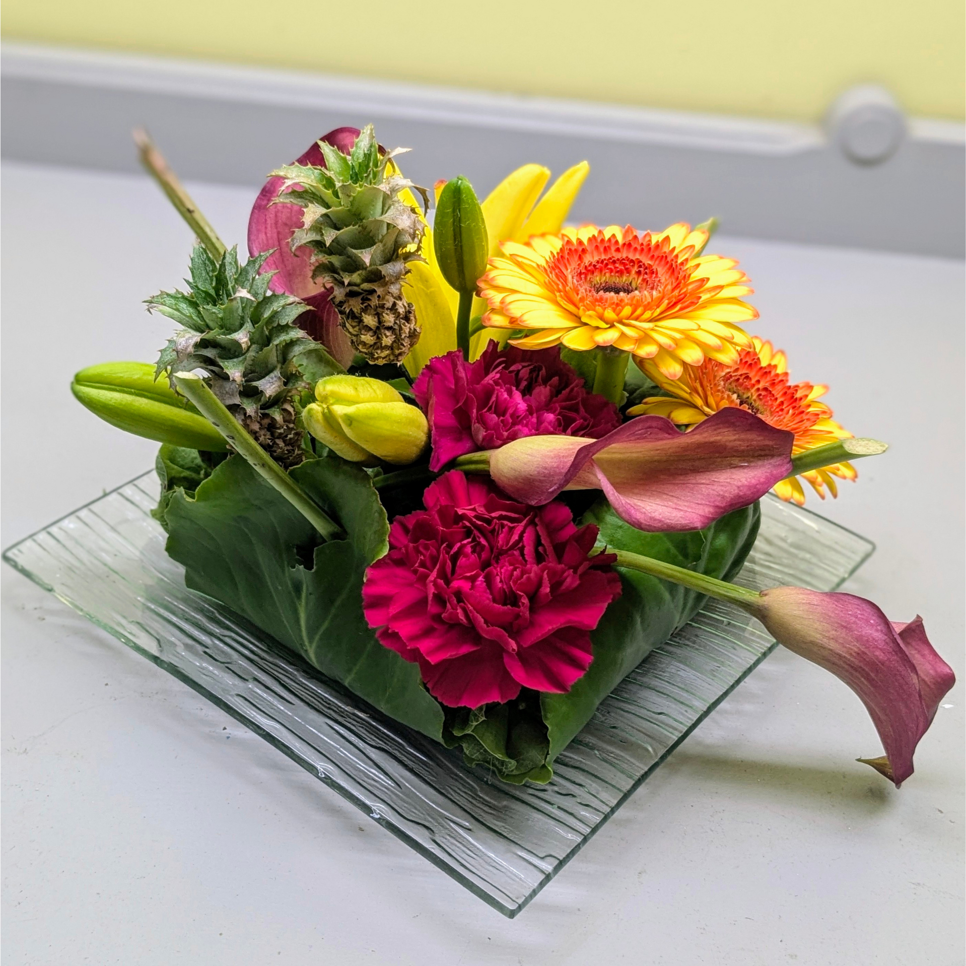 A bright and bold arrangement of premium flowers with a tropical vibe. Hand-arranged and presented on a glass tray.