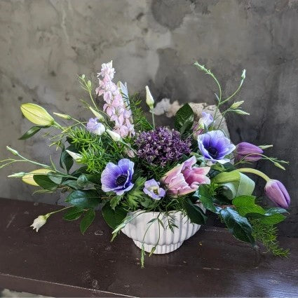 A show stopper of an arrangement of purples, blues, lavender & white blooms. Hand-arranged and presented in a ceramic vase.