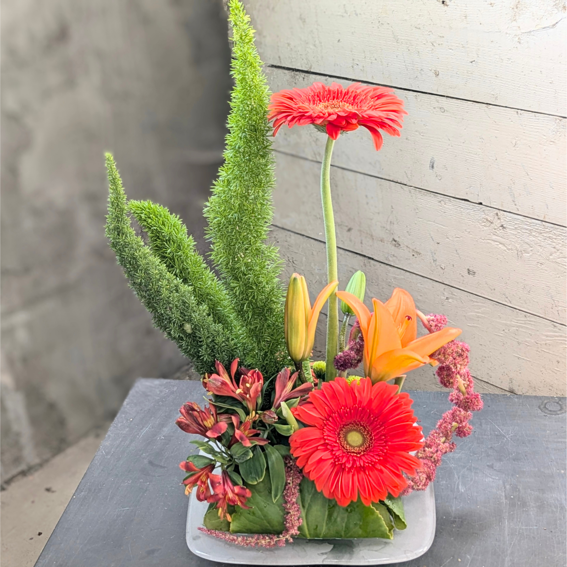 A bright and bold arrangement of seasonal flowers in bright cheerful colours. Hand-arranged and presented in a glass dish.